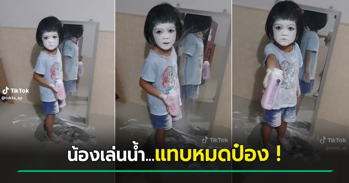 ขณะที่คนถ่ายคลิปก็ได้แต่บ่น ๆ "โอ้โห เผลอแป๊บเดียว ทำอะไร" น้องก็บอกว่า "เล่นน้ำ" พร้อมกับยื่นกระป๋องแป้งคืนมาให้ หน้าตานิ่งมาก เจอแบบนี้ดุต่อไม่ลง