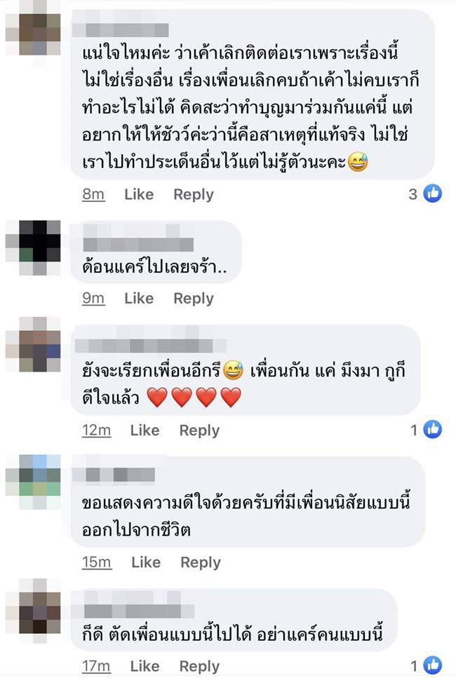 ชาวเน็ตต่างแสดงความคิดเห็นว่า เธอไม่ผิด ควรดีใจที่เพื่อนทำแบบนี้ สามารถตัดคนแบบนี้ออกไปได้ บางทีการที่เพื่อนมางานเราเราก็ดีใจแล้ว อย่าไปแคร์