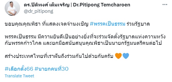ล่าสุด เวลาประมาณ 12.15 น. นายปิติพงศ์ เต็มเจริญ หัวหน้าพรรคเป็นธรรม มีการทวิตข้อความขอบคุณนายพิธา ลิ้มเจริญรัตน์ หัวหน้าพรรคก้าวไกลที่เชิญให้ร่วมรัฐบาลว่า พรรคเป็นธรรม มีความยินดีเป็นอย่างยิ่งที่จะร่วมจัดตั้งรัฐบาลแห่งความหวังกับพรรคก้าวไกล และยกมือสนับสนุนคุณพิธาเป็นนายกรัฐมนตรีคนต่อไป สร้างประเทศไทยที่เราฝันถึงร่วมกันไปด้วยกันครับ