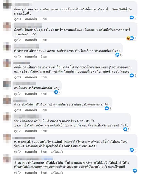 ซึ่งงานนี้มีหลายเสียงที่มองแตกต่างกัน บ้างก็มองว่า คนที่มารอคิวเข้าห้องน้ำทุกคนปวดเหมือนกันหมด จะให้มาแซงก็ไม่สมควร พร้อมกับแนะนำให้ใส่แพมเพิร์สเอาไว้ดีกว่าจะได้ไม่กวนคนอื่น ขณะที่บางส่วนกลับมองว่า ไม่ผิดหรอก แต่ไร้น้ำใจ มันเป็นเรื่องของน้ำใจเพื่อนมนุษย์ ถ้ามีเราต่อคนเดียวก็ให้ แต่ถ้าต่อกันอยู่หลายคนคงต้องถามคนข้างหลังด้วย