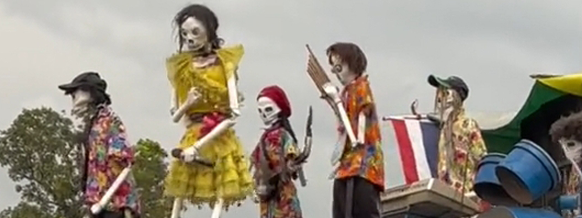 วงร็อกป่าช้าแตก ใช้หุ่นเชิดกระดูก สร้างสีสันขบวนแห่บุญบั้งไฟ จนเป็นไวรัลดัง