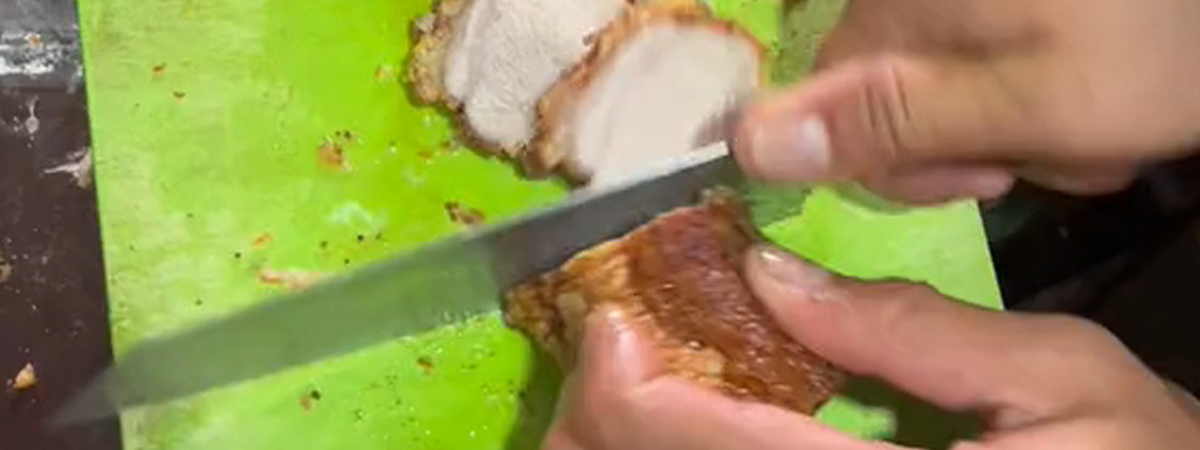 เอาใจสาวกหมูกรอบ หนุ่มโชว์เทคนิคหั่นหมูกรอบแบบกินง่าย พอดีคำ แต่สุดท้าย... ทำเอาน้ำตาร่วง