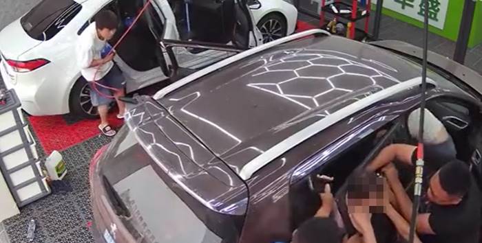 เมื่อแม่ของเด็กลงจากรถมาก็ยังไม่วายสนใจแต่ฝั่งของเธอ ไม่ได้เดินมาดูทางด้านที่ลูกน้อยอยู่ จนพนักงานที่อยู่ในร้านเห็นเหตุการณ์จึงรีบตะโกนบอกเธอ เมื่อเธอเห็นก็เกิดอาการลนลาน ส่วนคนอื่น ๆ ก็รีบเข้ามาช่วยเอามือกดกระจกลงจากคอเด็ก ส่วนแม่ของเธอก็เข้าไปในรถเพื่อพยายามเปิดกระจกลง แต่กว่าที่จะสำเร็จเด็กก็ร้องจนแทบขาดใจ ทั้งหมดเป็นเวลาเกือบ 30 วินาที
