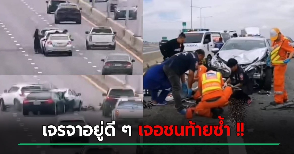 ชนระทึก รถ 3 คันชนกันกลางทางด่วนบูรพาวิถี กำลังถ่ายรูปเจรจาจู่ ๆ เก๋งขับตามมาชนท้ายซ้ำแบบเต็ม ๆ เจ็บระนาว 5 ราย หญิงสาวถูกอัดกับหน้ารถอาการสาหัส