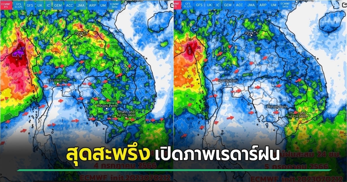 กรมอุตุนิยมวิทยา เปิดภาพเรดาร์พยากรณ์ฝนสะสมรายวันระหว่างวันที่ 4-12 กรกฎาคม 2566 มรสุมมีกำลังปานกลางถึงค่อนข้างแรง เตือนระวังฝนตกหนักบางแห่ง