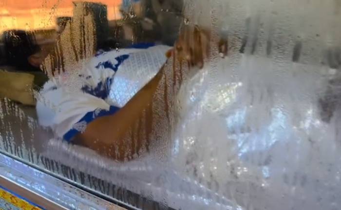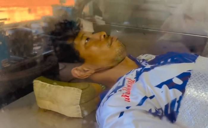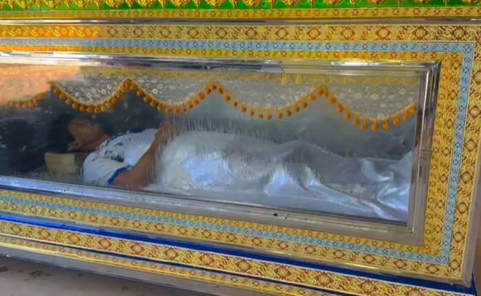 สภาพคนที่อยู่ข้างใน นอนแน่นิ่งไม่ไหวติง ตากะพริบ ปากซีด ๆ คาดว่าข้างในน่าจะเย็นจัดถึงกลายเป็นแบบนี้ไปได้ เย็นจนแข็งโดยแท้ ทั้งนี้โลงศพดังกล่าวราคา 45,000 บาท