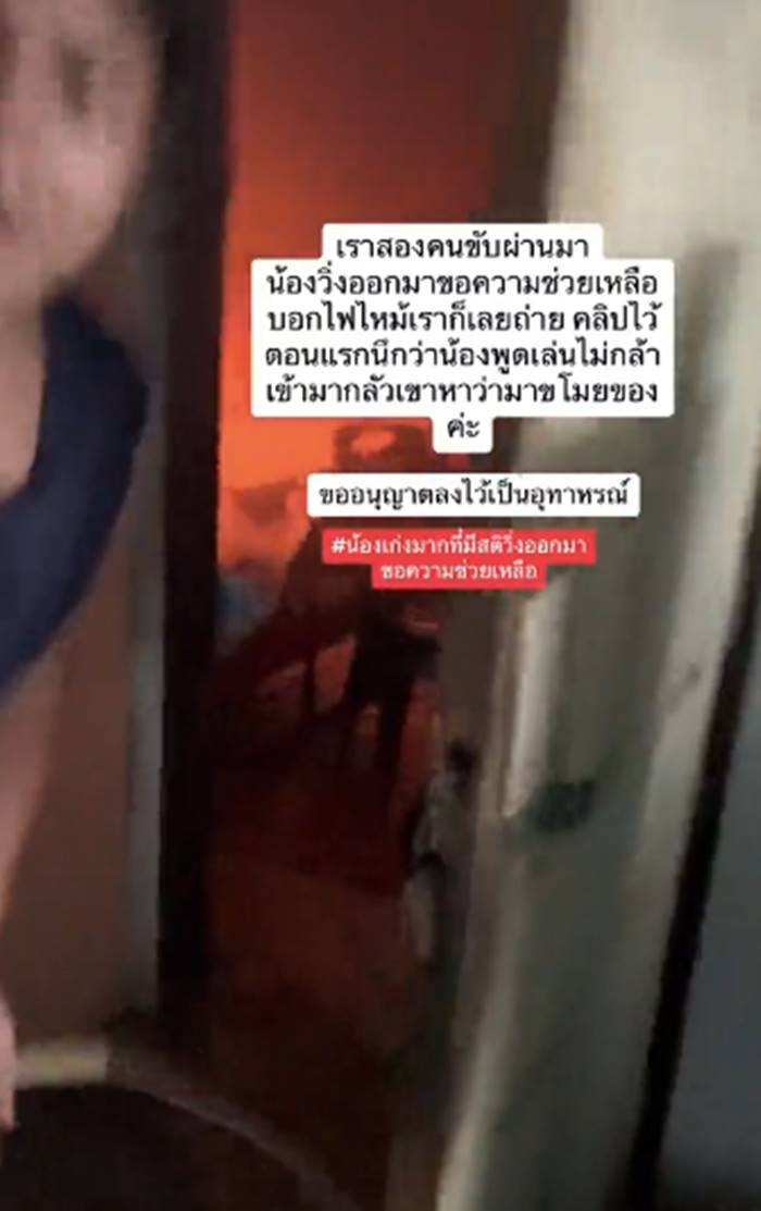 เจ้าของคลิปจึงรีบเข้าไปช่วยดับไฟที่กำลังไหม้ได้สำเร็จ โดยในคลิปน้องภูผาเล่าว่าอยู่กับตาแดง ส่วนแม่ไปทำงานยังไม่กลับ พอดีเห็นไฟไหม้จึงรีบปีนหน้าต่างออกมาขอความช่วยเหลือ เพราะประตูล็อกเอาไว้