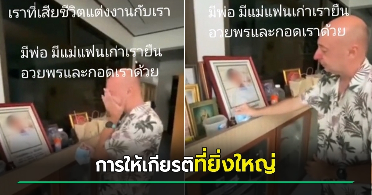 เปิดคลิปน้ำตารินบีบหัวใจ หนุ่มต่างชาติแฟนใหม่จุดธูปหน้ารูปศพของแฟนเก่าแฟนทั้งน้ำตา เพื่อขอแต่งงานกับคนรัก โดยมีพ่อแม่แฟนเก่าร่วมอวยพรและสวมกอด
