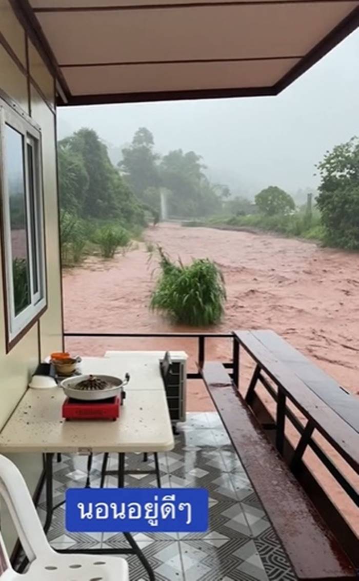 น้ำป่าไหลผ่านตัดระเบียงอย่างแรง เห็นแล้วสุดระทึก หยุดยาวทั้งทีเจอน้ำป่า