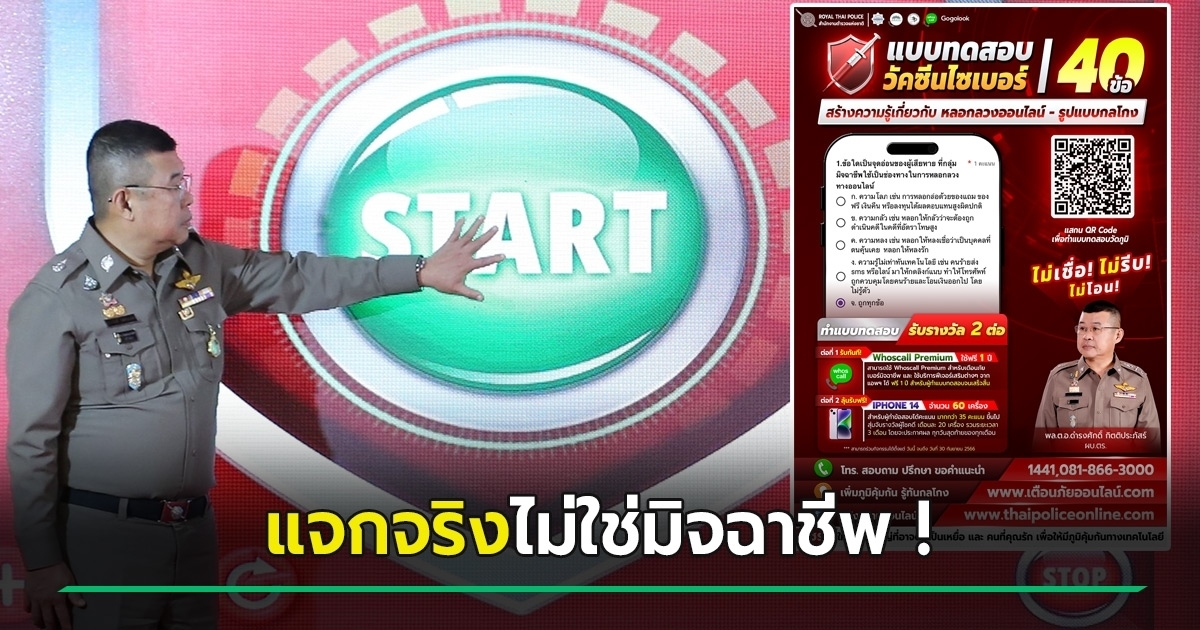ลิงก์จริงไม่ใช่มิจฉาชีพ ! สำนักงานตำรวจแห่งชาติ เชิญชวนประชาชนร่วมกิจกรรม ทำแบบทดสอบวัคซีนไซเบอร์ 40 ข้อ ลุ้นชิงรางวัลอีก 1 เดือนเท่านั้น แจกโค้ด WhosCall Premium ใช้ฟรี 1 ปี ใครทำได้ทุกคน แถมได้ลุ้นรับไอโฟน 14 จำนวน 20 เครื่อง