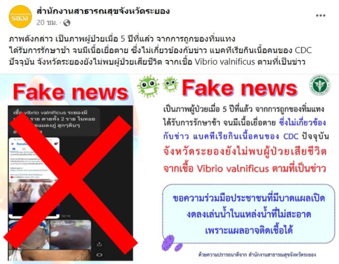 นอกจากนี้เฟซบุ๊ก สาธารณสุขจังหวัดระยอง ยังได้ประกาศอีกว่าข่าวที่กำลังแชร์กันเป็นเฟกนิวส์ ภาพดังกล่าวเป็นภาพผู้ป่วยเมื่อ 5 ปีที่แล้วจากการถูกของทิ่มแทง ซึ่งได้รับการรักษาช้าจนมีเนื้อเยื่อตาย ยืนยันไม่เกี่ยวข้องกับข่าวแบคทีเรียกินเนื้อคนของ CDC ปัจจุบันระยองยังไม่พบผู้ป่วยเสียชีวิตจากเชื้อ Vibrio Valnificus ตามที่เป็นข่าว