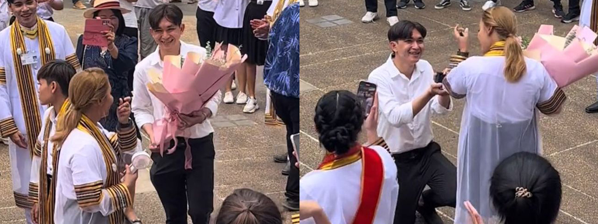 ผู้ใช้ TikTok @tain0822 ได้เผยภาพบรรยากาศงานรับปริญญา ที่มหาวิทยาลัยราชภัฏอุดรธานี ในระหว่างที่รุ่นน้องกำลังบูมให้บัณฑิตที่เรียนจบ หนุ่มโผล่เซอร์ไพรส์บัณฑิตสาว พร้อมเอาช่อดอกไม้มาให้ นอกจากนี้ยังเตรียมแหวนและคุกเข่าขอแต่งงานเธอ เพื่อนบัณฑิตและรุ่นน้องพากันแสดงความยินดีกับทั้งคู่ อีกทั้งยังเป็นภาพที่เรียกน้ำตาชาวเน็ตได้เป็นอย่างดี