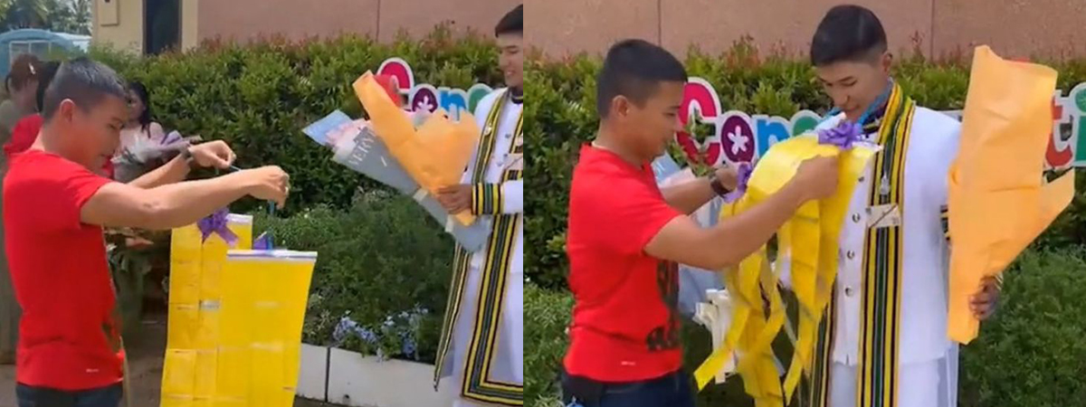 ผู้ใช้ TikTok @usern520acnh35 ซึ่งเป็นพี่ชาย ได้เผยโมเมนต์น่ารักปนฮา ระหว่างไปงานรับปริญญาน้องชายตัวเอง พร้อมกับหาของพิเศษให้เพื่อแสดงความยินดีกับความสำเร็จของน้อง โดยการพรินต์ใบสลิปโอนเงิน แล้วเอามาทำเป็นพวงมาลัย ให้เห็นกันไปเลยว่า กว่าน้องจะประสบความสำเร็จได้ พี่ส่งเสียค่าเรียนไปเท่าไร ชาวเน็ตพากันขำและเอ็นดูในความครีเอตของพี่ชายกันทั้งโซเชียล