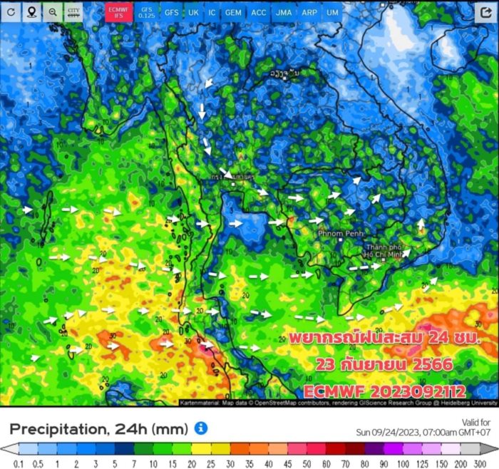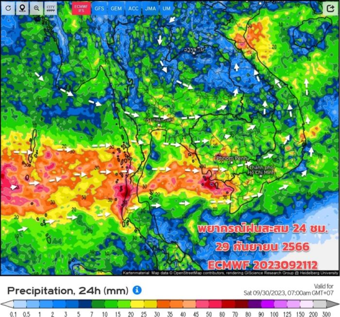 - สถานการณ์ของพายุหมุนเขตร้อนในระยะนี้ มีเพียงหย่อมความกดอากาศต่ำก่อตัวบริเวณทะเลจีนใต้ ฝนที่ตกในขณะนี้มาจากอิทธิพลของมรสุมตะวันตกเฉียงใต้ และร่องมรสุม (ข้อมูลนี้อาจมีการเปลี่ยนแปลงได้ตามข้อมูลนำเข้าใหม่ ภายใต้เงื่อนไขของปีที่เกิดปรากฎการณ์เอลนีโญ ซึ่งทำให้สภาวะฝนของไทยเปลี่ยนแปลงไป ใช้เพื่อประกอบการตัดสินใจ)