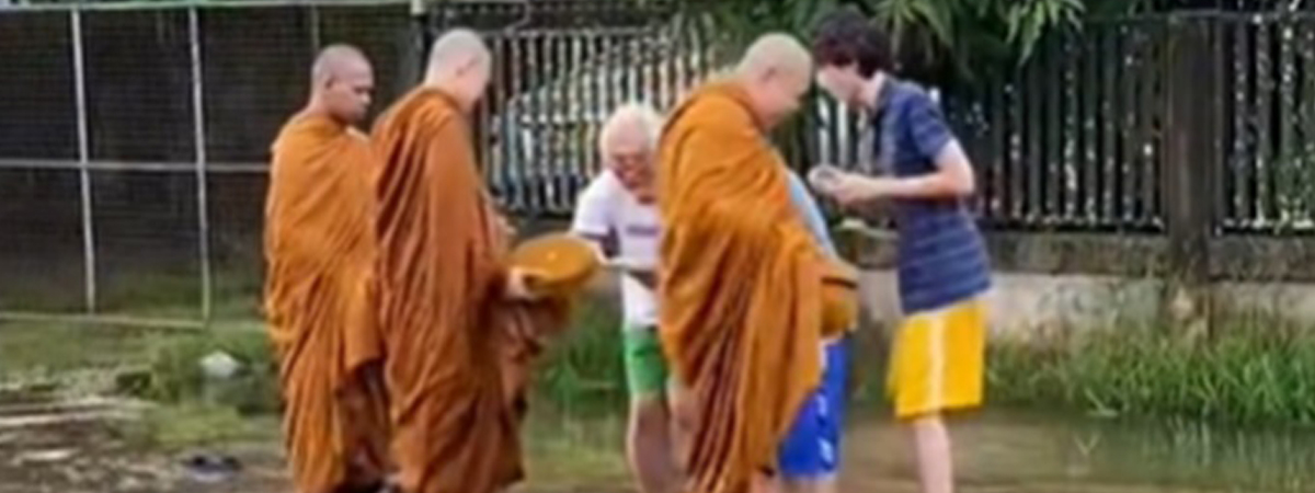 ผู้ใช้ TikTok @porty_b ได้เผยภาพตอนทำบุญตักบาตรในช่วงเช้า ถึงแม้ถนนจะน้ำท่วมสักแค่ไหน ก็ไม่เป็นอุปสรรคต่อการใส่บาตรใด ๆ หลังจากที่พระเดินบิณฑบาต โยมก็เริ่มถอดรองเท้า เอาของถวายพระใส่บาตร พร้อมรับพรจากพระ แต่ในระหว่างนั้นรองเท้าไหลไปตามน้ำแล้ว พอรับพรเสร็จถึงกับวิ่งไปเก็บแทบไม่ทันเลยทีเดียว