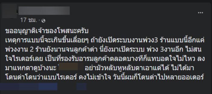 หนุ่มไรเดอร์ ระบุว่า "ผลกระทบจากงานแบชแบบใหม่ตอนแรกก็ไม่อยากจะลงรูปนี้ แต่มันอึดอัดใจ นี่คือสิ่งที่เจอมา ผมกลายเป็นที่รองรับอารมณ์ลูกค้า เจอลูกค้ารอรับของ ไม่พูดไม่จาแล้วปาน้ำทั้งแก้วใส่ผมแล้วขึ้นคอนโดไป (ถ้าเป็นแกงร้อน ๆ ไม่อยากคิดเลย)