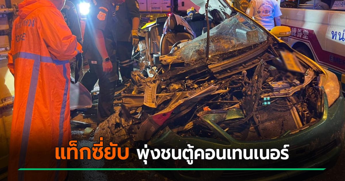 รถบรรทุกเสียหลัก ทำตู้คอนเทนเนอร์หล่น แท็กซี่รับ ผดส. จากสุวรรณภูมิพุ่งชนอย่างจัง รถพังยับอัดร่างคนขับ สลด ผดส. เสียชีวิต 1 ราย ญาติคาใจ ตู้คอนเทนเนอร์หลุดเหมือนไม่ได้ล็อกกับรถบรรทุก