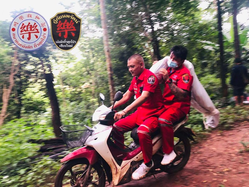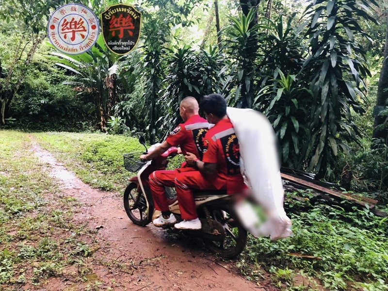 ฤาษีเสียชีวิตท่านั่งสมาธิกลางป่าลึก กู้ภัยขับรถไปรับศพไม่ได้ ต้องเดินเท้า 2 กม. ห่อผ้าขาวแบกขึ้นหลัง ซ้อนมอเตอร์ไซค์ออกมา