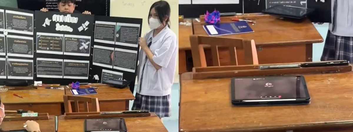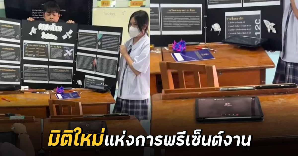 ผู้ใช้ TikTok @swr12c ได้เผยภาพนักเรียนกลุ่มหนึ่ง กำลังพรีเซ็นต์งานกลุ่มหน้าห้องเรียน ในคาบวิชาวิทยาศาสตร์ ในระหว่างที่ครูกำลังตั้งใจฟังสิ่งที่นักเรียนนำเสนอ นักเรียนในกลุ่มแก้ปัญหาเพื่อนไม่มาในวันนั้น ด้วยการให้คนที่ไม่มาพรีเซ็นต์ผ่านระบบคอล พร้อมเปิดลำโพงให้ทุกคนในห้องเรียนได้ยิน เป็นวิธีแก้ปัญหาที่จีเนียส จนกลายเป็นไวรัลดังในตอนนี้