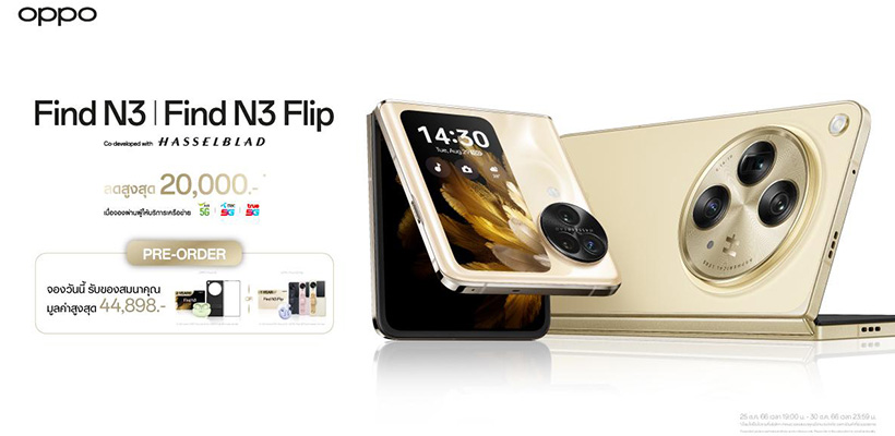 สำหรับ OPPO Find N3 สมาร์ตโฟนจอพับระดับแฟลกชิปที่เบา บาง ทรงพลัง วางจำหน่ายในราคา 69,990 บาท และ OPPO Find N3 Flip วางจำหน่ายในราคา 34,990 บาท สำหรับผู้ที่สั่งซื้อ OPPO Find N3 และ OPPO Find N3 Flip ล่วงหน้าระหว่างวันนี้ – 30 ตุลาคม 2566 รับฟรีทันทีของสมนาคุณรวมมูลค่าทั้งสิ้น 44,898 บาท