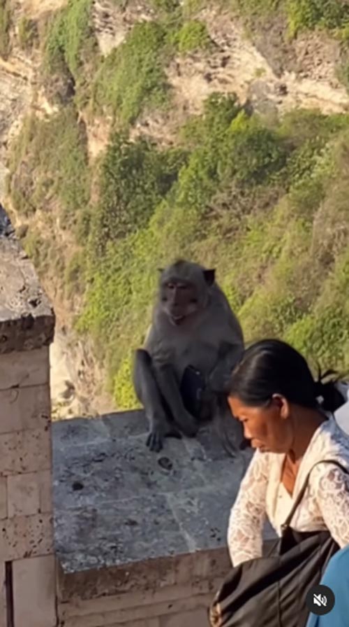 โดยเมื่อวันที่ 29 ตุลาคม 2566 เว็บไซต์เวิลด์ออฟบัซ รายงานภาพเหตุการณ์ระทึกของหญิงรายหนึ่ง ที่กำลังยืนเผชิญหน้ากับลิงตัวใหญ่ด้วยสีหน้าสุดว้าวุ่น บริเวณกำแพงริมผาจุดหนึ่งในจังหวัดบาหลี ประเทศอินโดนีเซีย ขณะที่ลิงตัวนี้กำลังถือ iPhone เครื่องหนึ่งไว้ในมือ คาดว่าคงเป็นสมาร์ตโฟนของหญิงชุดขาวที่ถูกฉกไปนั่นเอง
