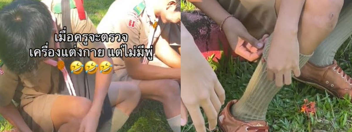 ผู้ใช้ TikTok @pompamur ได้เผยภาพตอนที่ครูกำลังตรวจความเรียบร้อยของเครื่องแบบลูกเสือ ว่านักเรียนแต่งถูกระเบียบหรือไม่ มีอะไรขาดหายไปบ้างรึเปล่า แต่มีนักเรียนคนหนึ่งไม่มีพู่ที่ถุงเท้า เลยแก้ไขสถานการณ์เฉพาะหน้า เด็ดดอกเข็มที่อยู่บริเวณนั้นมาทำเป็นพู่ แต่ดูเหมือนว่าโดนจับได้ซะก่อน เลยต้องล้มเลิกแผนนี้ไป เกือบเนียนแล้วเชียว