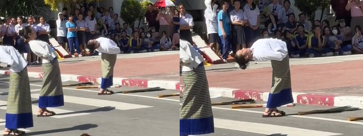 ผู้ใช้ TikTok @tarnsugar ได้เผยภาพการแข่งเชียร์ลีดเดอร์ของโรงเรียนจักรคำคณาทร จังหวัดลำพูน มีนักเรียนอยู่คนหนึ่งได้สร้างตำนานบทใหม่ จนครูและนักเรียนที่นั่งดูอยู่ถึงกับตะลึง ด้วยท่าแอ่นเอวแบบฉ่ำ โชว์ตัวอ่อนในชนิดที่ว่าทีมอื่นถึงกับยอมแพ้ ชาวเน็ตต่างพูดเป็นเสียงเดียวกันว่า เห็นแล้วปวดหลังแทนจริง ๆ