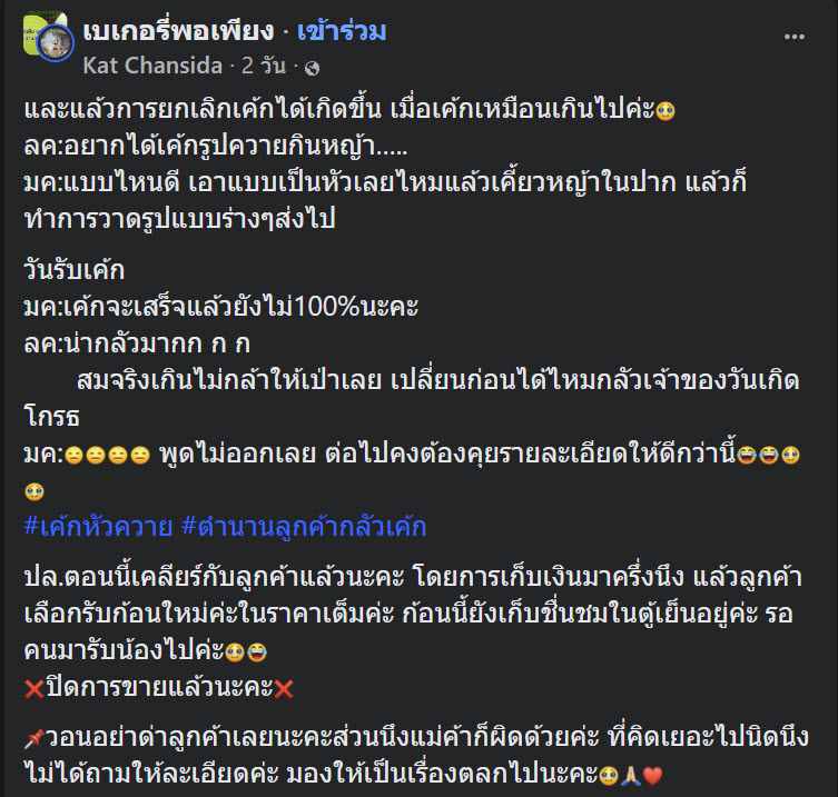 "และแล้วการยกเลิกเค้กได้เกิดขึ้น เมื่อเค้กเหมือนเกินไปค่ะ ลูกค้าอยากได้เค้กรูปควายกินหญ้า ร้านเสนอว่าเอาแบบเป็นหัวเลยไหมแล้วเคี้ยวหญ้าในปาก แล้วก็ทำการวาดรูปแบบร่าง ๆ ส่งไป พอถึงวันรับเค้ก ลูกค้าเห็นบอกว่าน่ากลัวมาก สมจริงเกิน ไม่กล้าให้เป่าเลย เปลี่ยนก่อนได้ไหม กลัวเจ้าของวันเกิดโกรธ พอได้ยินก็พูดไม่ออกเลย ต่อไปคงต้องคุยรายละเอียดให้ดีกว่านี้