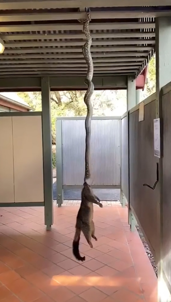 เหตุการณ์ดังกล่าวเกิดขึ้นที่เมืองโกลด์โคสต์ ในรัฐควีนส์แลนด์ ประเทศออสเตรเลีย จากคลิปวิดีโอแสดงให้เห็นว่า งูตัวดังกล่าวห้อยตัวลงมาจากหลังคาจนเกือบจะถึงพื้น เพื่อเขมือบจับตัวพอสซั่มที่อยู่ในสภาพแน่นิ่งไม่มีชีวิต โดยงูพยายามออกแรงขดตัวเพื่อที่จะดึงเหยื่อขึ้นไปกับมัน แต่สุดท้ายก็ดูเหมือนว่าน้ำหนักของตัวพอสซั่มจะเกินกว่าความสามารถของงู มันจึงยอมปล่อยร่างของพอสซั่มร่วงตกลงมา