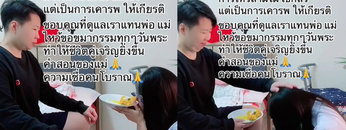 ผู้ใช้ TikTok @saranyajomja ได้เผยภาพตอนกราบไหว้สามี ตามความเชื่อของคนสมัยก่อน ซึ่งคุณแม่ของเธออายุ 79 ปี สอนว่าการกราบไหว้สามีจะทำให้ชีวิตเจริญ เธอเลยนำดอกไม้ 5 คู่ เทียน 5 คู่ และเงินเหรียญ 5 ไหว้ขอขมาสามีในทุก ๆ วันพระ เพื่อเป็นการเคารพ ให้เกียรติ ขอบคุณที่ดูแลแทนพ่อแม่