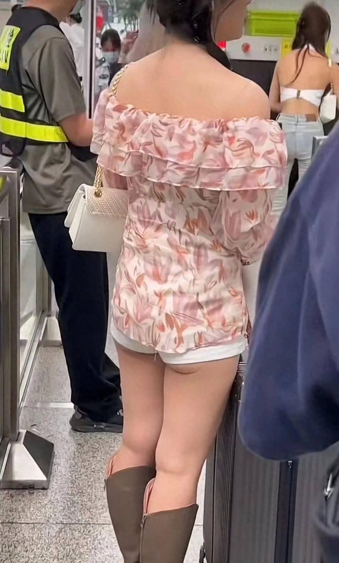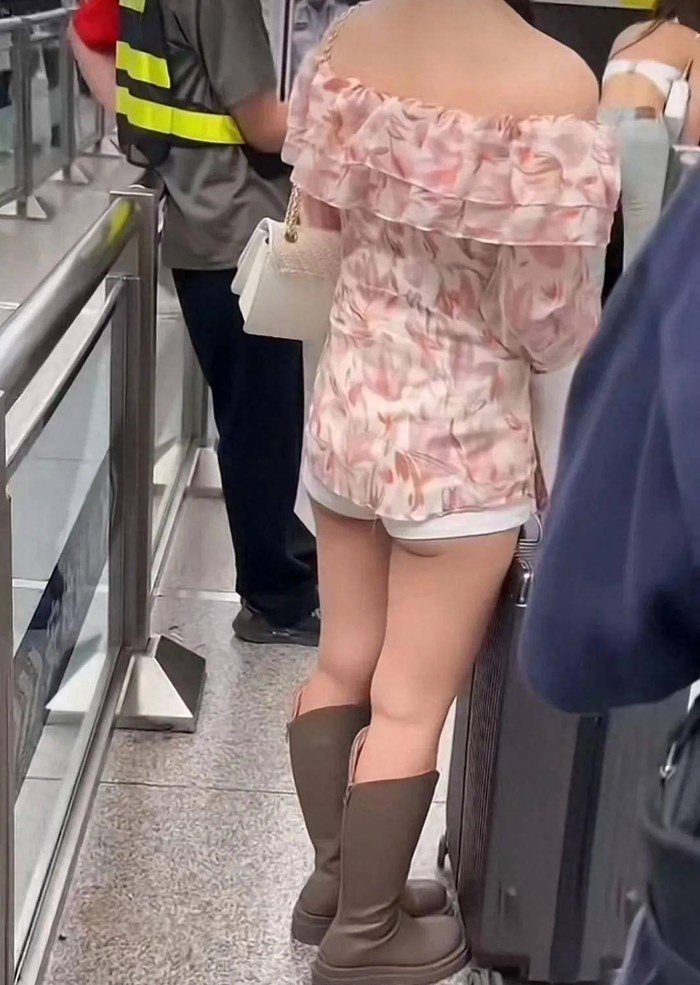 จากภาพแสดงให้เห็นว่า หญิงสาวรายนี้สวมเสื้อพิมพ์ลายแบบบางและเปิดไหล่ ด้านล่างสวมกางเกงสีขาวขาสั้นกุด จนเห็นบั้นท้ายโผล่ออกมาเกือบครึ่งก้น ซึ่งดูเหมือนว่าจะเป็นแฟชั้นสไตล์ฤดูร้อนถึงร้อนมาก ฮอตแบบสุด ๆ แต่ปรากฏว่าเมื่อมองไปที่รองเท้า เธอกลับสวมใส่รองเท้าบูตยาวขึ้นมาจนเกือบถึงหัวเข่า เป็นการผสมผสานสไตล์ที่ไม่อาจอธิบายได้