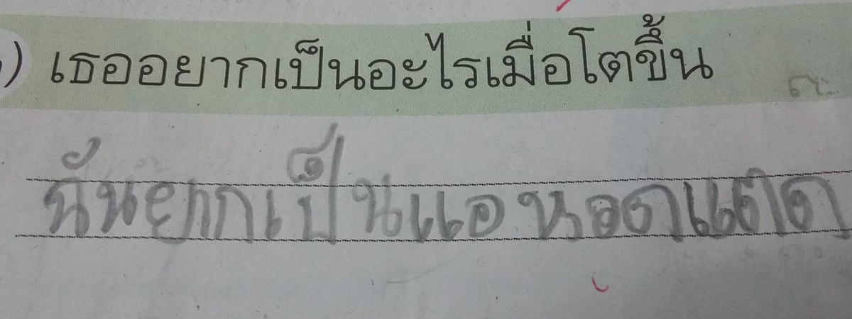 ทวิตเตอร์ @Elleze2Aun ได้เผยภาพการบ้านของนักเรียนชั้น ป.1 โดยให้โจทย์ว่า เธออยากเป็นอะไรเมื่อโตขึ้น มีนักเรียนคนหนึ่งอยากเป็นแอร์โฮสเตส เลยเขียนคำตอบลงไป แต่สิ่งที่น้องเขียน นอกจากความหมายจะผิดแล้ว ยังทำครูสะดุ้งอีกด้วย ตอนตรวจการบ้านถึงกับกลั้นขำไม่อยู่