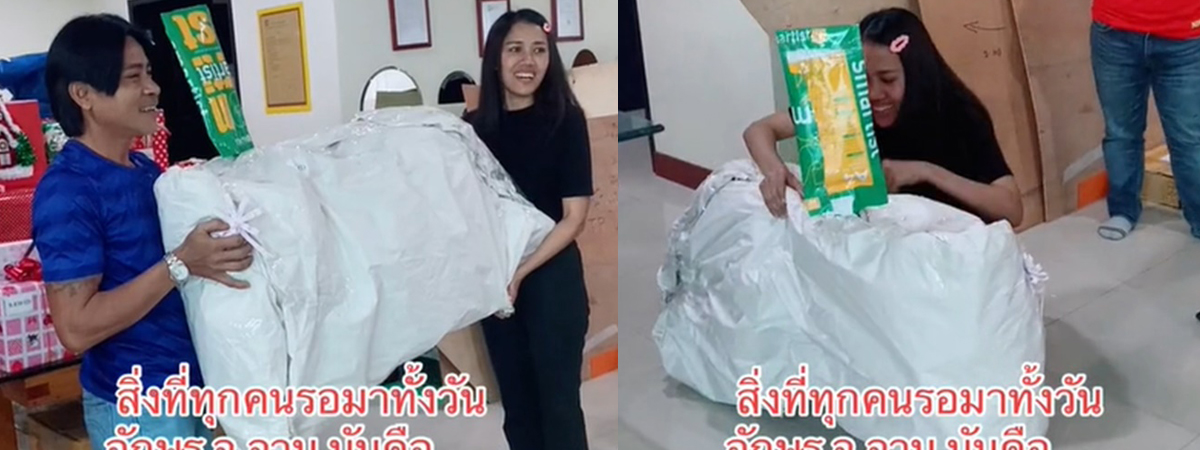 ผู้ใช้ TikTok @pagsian2822 ได้เผยภาพตอนจับฉลากของขวัญปีใหม่ที่บริษัทแห่งหนึ่ง เหล่าพนักงานเตรียมของขวัญสุดพิเศษเพื่อให้ได้ลุ้นกันว่าใครจะได้ของใครบ้าง สำหรับสาวคนนี้เธอจับได้ตัวอักษร จ จาน แถมของขวัญมาชิ้นใหญ่ด้วย แวบแรกคิดว่าได้จักรยานกลับบ้านแน่ ๆ พอเปิดดูเท่านั้นแหละ จ จาน ที่ว่าคือของจิปาถะนั่นเอง ทั้งเซอร์ไพรส์และขำในเวลาเดียวกัน