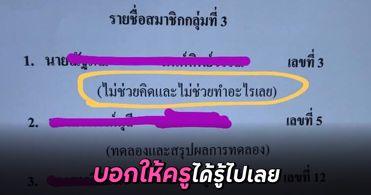 เฟซบุ๊กเพจ เรียนไปเหอะ อยากสอนครับ ได้เผยภาพรายงานของนักเรียนกลุ่มที่ 3 นอกจากจะเขียนชื่อแล้ว ยังบอกหน้าที่ของแต่ละคนด้วยว่า ใครทำอะไรบ้าง ครูจะได้รู้และให้คะแนนถูก และแน่นอนว่าคนแรกเลขที่ 3 พีคสุด เพื่อนในกลุ่มเขียนตรง ๆ ไปเลยว่า ไม่ช่วยทำอะไรเลย เป็นวิธีที่โดนใจชาวเน็ต จนอยากเอาไปใช้บ้าง เวลาทำงานกลุ่ม