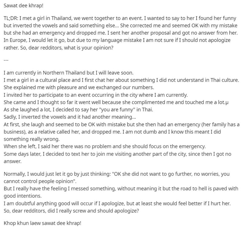 ทั้งนี้ ได้มีฝรั่งคนหนึ่ง ได้มาโพสต์เอาไว้ใน Reddit ที่ปัจจุบันเขาอาศัยอยู่ที่จังหวัดหนึ่งทางภาคเหนือของไทย เขาได้เจอกับสาวไทยคนหนึ่ง ทั้งคู่ได้พูดคุยกันถูกคอ โดยเฉพาะการที่สาวไทยได้ช่วยอธิบายให้เขาเข้าใจเกี่ยวกับเรื่องวัฒนธรรมไทยที่เขายังมีข้อสงสัย ทุกอย่างเป็นไปได้ด้วยดี และทั้งสองคนได้มีการแลกเบอร์มือถือกัน