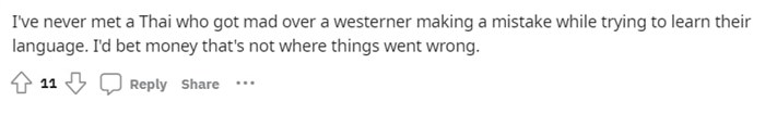 ในขณะที่บางคนก็บอกว่า ฝรั่งคนนี้กำลังหลงสาวไทยอย่างหนักจนคิดมากไปแล้ว คนไทยไม่โกรธหรอกหากบางครั้งฝรั่งจะพูดผิดไป เธอแค่ไม่ได้ชอบเขาเท่านั้น