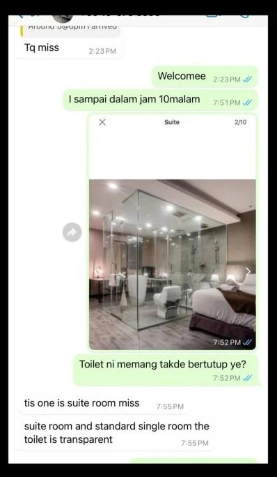 วันที่ 11 กุมภาพันธ์ 2567 เว็บไซต์ Sinchew รายงานว่า ผู้ใช้เฟซบุ๊กหญิงรายหนึ่งในมาเลเซียได้ออกมาแชร์ประสบการณ์ยากจะลืม จากการจองห้องพักโรงแรมหรูเมื่อไม่นานมานี้ โดยเผยว่าหลังจากที่เธอจองห้องพักไปแบบเร่งรีบ ไม่ได้อ่านรีวิวใด ๆ ล่วงหน้า ก็เพิ่งได้รู้ว่าห้องพักดังกล่าวไม่มีความเป็นส่วนตัวหลงเหลือสักนิด ด้วยรูปแบบการดีไซน์แบบเปิดโล่ง วัสดุกั้นห้องน้ำเป็นแบบโปร่งใส สามารถมองเห็นทุกกิจกรรมที่เกิดขึ้นในห้องน้ำได้อย่างชัดเจน