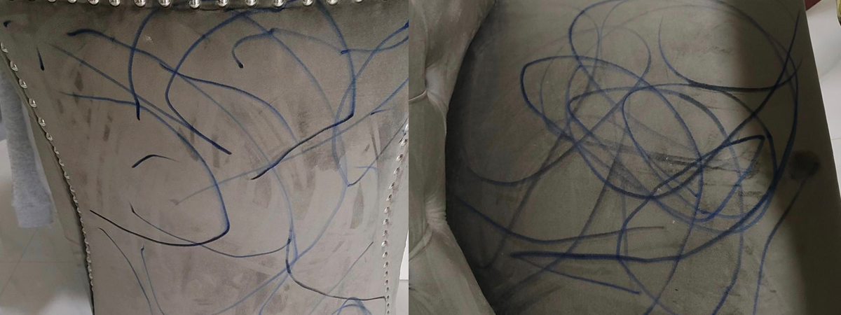 สภาพเละกระจาย จิตรกรตัวน้อย ใช้ปากกาละเลงทั่วเก้าอี้ จนแม่เห็นหัวแทบปวด