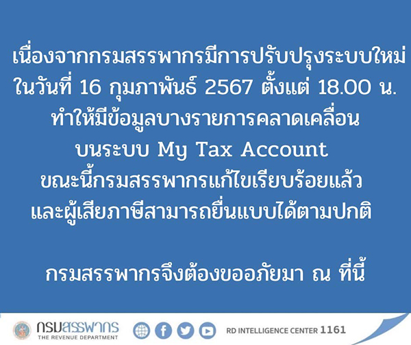 ขณะที่ล่าสุด (17 กุมภาพันธ์) เฟซบุ๊ก สรยุทธ สุทัศนะจินดา กรรมกรข่าว รายงานว่า กรมสรรพากรได้ออกมาชี้แจงเบื้องต้นต่อกรณีดังกล่าว ระบุว่า "เนื่องจากกรมสรรพากรมีการปรับปรุงระบบใหม่ในวันที่ 16 กุมภาพันธ์ 2567 ตั้งแต่ 18.00 น. ทำให้มีข้อมูลบางรายการคลาดเคลื่อนบนระบบ My Tax Account ขณะนี้กรมสรรพากรแก้ไขเรียบร้อยแล้ว และผู้เสียภาษีสามารถยื่นแบบได้ตามปกติ กรมสรรพากรจึงต้องขออภัยมา ณ ที่นี้"