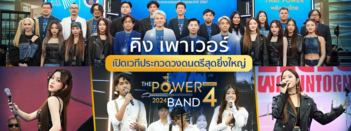 กลับมาอีกครั้งกับเวทีประกวดวงดนตรีสากลที่ยิ่งใหญ่ที่สุดในประเทศ ประจำปี 2567 “THE POWER BAND 2024 SEASON 4” ที่จัดต่อเนื่องมาเป็นปีที่ 4 แล้ว โดย คิง เพาเวอร์ ไทย เพาเวอร์ พลังคนไทย ดำเนินกิจกรรมเพื่อสังคม ภายใต้กลุ่มบริษัท คิง เพาเวอร์ ร่วมมือกับวิทยาลัยดุริยางคศิลป์ มหาวิทยาลัยมหิดล ผนึกกำลังกับ 6 ค่ายเพลงดัง อย่าง Muzik Move, LOVEiS Entertainment, Smallroom, What The Duck, Warner Music Thailand และ XOXO Entertainment พร้อมด้วยพันธมิตรที่ร่วมให้การสนับสนุน ได้แก่ บริษัท สิงห์ คอร์เปอเรชั่น จํากัด, นิตยสาร Guitar MAG, บริษัท สยามดนตรียามาฮ่า จำกัด และ T-POP ที่จะมาร่วมเฟ้นหานักดนตรีตัวจริงมากความสามารถในการก้าวสู่เส้นทางศิลปินมืออาชีพ ภายใต้คอนเซ็ปต์ “Let the Music Power Your World เป็นได้สุด เป็นไปได้ ด้วยพลังแห่งดนตรี” ชิงรางวัลรวมกว่า 2 ล้านบาท พร้อมร่วมทำซิงเกิลกับโปรดิวเซอร์มืออาชีพ และโอกาสในการร่วมแสดงในเทศกาลดนตรีระดับประเทศ