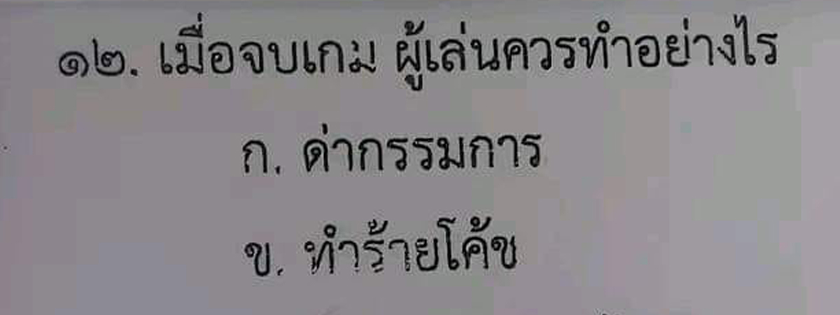 เฟซบุ๊ก Monkey D Garp ได้โพสต์ในกลุ่ม เล่นยืนเดี่ยว ซึ่งเป็นภาพตอนทำข้อสอบเกี่ยวกับการเล่นกีฬา โดยให้นักเรียนกากบาทเลือกคำตอบที่ถูกต้องที่สุด โจทย์มีอยู่ว่า เมื่อจบเกม ผู้เล่นควรทำอย่างไร แต่พอดูคำตอบที่ให้เลือก แต่ละข้อมหาโหดทั้งนั้น ทำเอานักเรียนหยุดชะงักไปเลยทีเดียว สงสัยครูผู้ออกข้อสอบท่าทางจะเป็นคนรุนแรงน่าดู