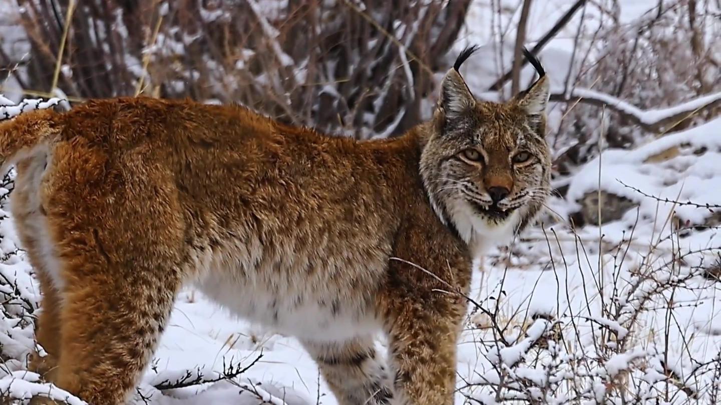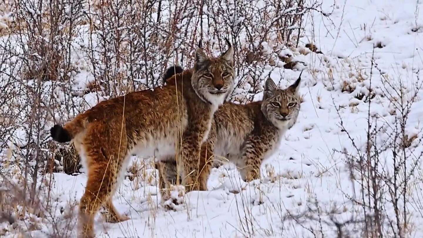 เผยภาพแมวสกุลลิงซ์ หรือแมวป่า 2 ตัว ที่กำลังออกล่าเหยื่อบนเนินเขาหิมะ ที่ถูกถ่ายโดยช่างภาพสายสัตว์ป่าของจีน
