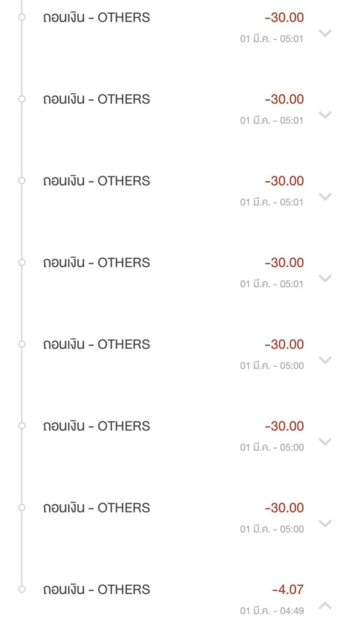 เมื่อลงรายละเอียดเวลาของการตัดบัตร พบว่า เริ่มตัดครั้งแรกตอน 04.49 น. จำนวน 4.07 บาท จากนั้นก็โดดมาตัดตอน 05.00 น. เป๊ะ ๆ ยอด 30 บาท 3 ยอดรวด และเวลา 05.01 น. ก็มีอีก 4 ยอด เป็นแบบนี้ไปเรื่อย ๆ จนครบ 87 ครั้ง