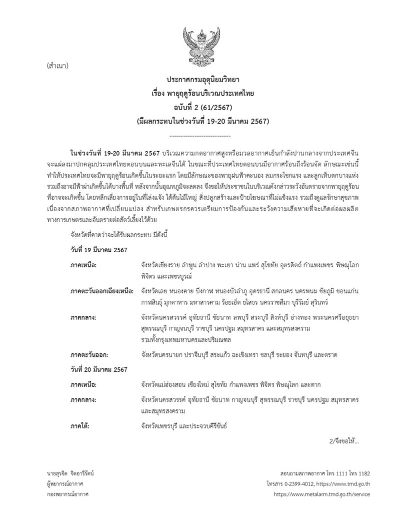 วันที่ 17 มีนาคม 2567 กรมอุตุนิยมวิทยา ออกประกาศเรื่อง พายุฤดูร้อนบริเวณประเทศไทย ฉบับที่ 2 (61/2567) มีผลกระทบในช่วงวันที่ 19-20 มีนาคม 2567 โดยมีรายละเอียดดังนี้