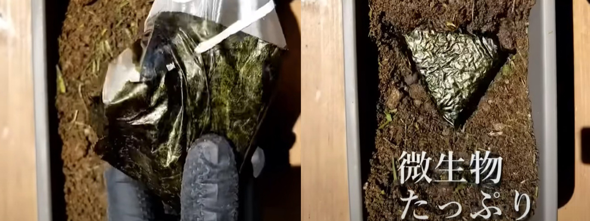 ยูทูบช่อง つりきっぷ / 家庭で自然を楽しむ ได้เผยภาพหนุ่มชาวญี่ปุ่น ได้ทำการทดลองปั้นข้าวปั้นไส้ปลาแซลมอน ห่อด้วยกระดาษฟอยล์ แล้วขุดหลุมฝังไว้ในกระถางดิน รดน้ำให้ทั่วดิน ทิ้งไว้ประมาณ 1 เดือน พอครบกำหนดก็ขุดมันขึ้นมา เห็นผลลัพธ์ตรงที่ขนาดของข้าวปั้นเล็กลง ถูกจุลินทรีย์ในดินกัดกิน และแบ่งครึ่งข้าวปั้น 2 ชิ้น พบไส้ปลาแซลมอนที่อยู่ข้างในยังเหมือนเดิม ไม่มีการย่อยสลายแม้แต่นิดเดียว