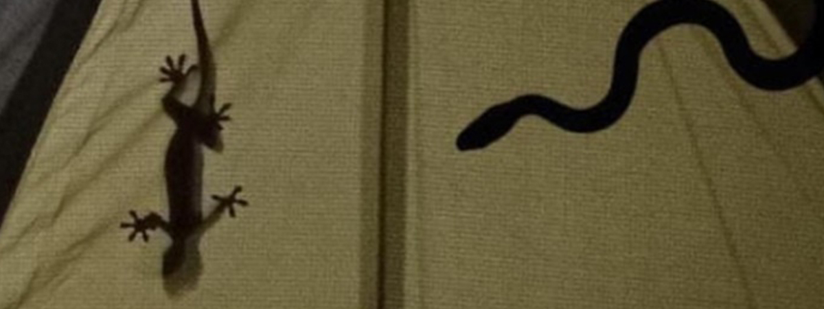 เฟซบุ๊ก Bill Pookrongtong ได้โพสต์ในกลุ่ม จุดกางเต็นท์ ซึ่งเป็นภาพบรรยากาศตอนนอนในเต็นท์ ระหว่างที่กำลังหลับ เห็นบางอย่างชวนขนลุกมาอยู่ตรงหน้าเต็นท์ ไม่ได้มาแค่ตัวเดียว ยังมีมาเพิ่มอีกตัวด้วย คาดว่าเป็นงูกับตุ๊กแกแน่ ๆ สถานการณ์ต่อจากนี้คงได้นอนดูชอตสู้กันหน้าเต็นท์ก็เป็นได้