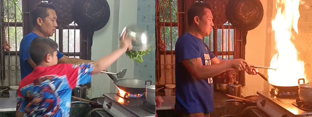 ผู้ใช้ TikTok @ohoophirunlak ได้เผยภาพพ่อลูกคู่หนึ่ง แสดงฝีมือในการทำผักบุ้งไฟแดง ในเมื่อมีลูกชายเป็นผู้ช่วย อาหารจะต้องออกมาอร่อยแน่ ๆ หลังจากที่เทผักบุ้งลงกระทะ ไฟมาของจริง แต่พอมองไปที่กระทะ ทำไมแปลก ๆ นะ ผักบุ้งหายไปไหน ที่แท้ลูกชายเทไปข้างเตาแก๊สซะงั้น