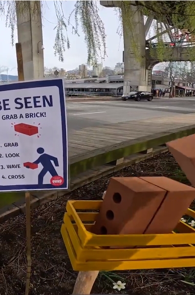 โดยคลิปไวรัลดังกล่าวมาจากประเทศแคนนาดา บนถนนแกรนด์วิลล์ ไอแลนด์ ในเมืองแวนคูเวอร์ ตามรายงานของเว็บไซต์ CBC News เผยว่า อาสาสมัครจาก Vision Zero Vancouver องค์กรไม่แสวงผลกำไรที่มีเป้าหมายเพื่อลดการเสียชีวิตและการบาดเจ็บจากการจราจร ได้จัดทำแคมเปญสุดพิเศษขึ้นมา โดยการนำก้อนอิฐมาตั้งวางไว้ให้คนเดินข้ามถนนหยิบไปใช้ พร้อมกับคำแนะนำการใช้สั้น ๆ 4 ข้อ ได้แก่