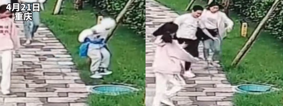 เว็บไซต์ Douyin ได้เผยภาพเหตุการณ์ที่เมืองฉงชิ่ง ประเทศจีน มีครอบครัวหนึ่งกำลังเดินเล่นในสวนสาธารณะ แล้วมีท่ออยู่บริเวณนั้น ตามประสาที่เด็กอยู่ในวัยกำลังซน ลูกชายเห็นฝาท่อแล้วกระโดดเหยียบขึ้นไป หารู้ไม่ว่าฝาที่เอามาวางเป็นฝาปลอม เลยทำให้พลัดตกลงไป พ่อเห็นรีบวิ่งไปช่วยทันที โชคดีที่ท่อไม่ได้ลึกมาก ลูกชายเลยปลอดภัย ยิ่งไปกว่านั้นยังโดนแม่ตีซ้ำ และพี่สาวก็ยืนขำที่เห็นน้องโดนตี สะท้อนให้เห็นถึงความเป็นครอบครัวของชาวเอเชียได้เป็นอย่างดี
