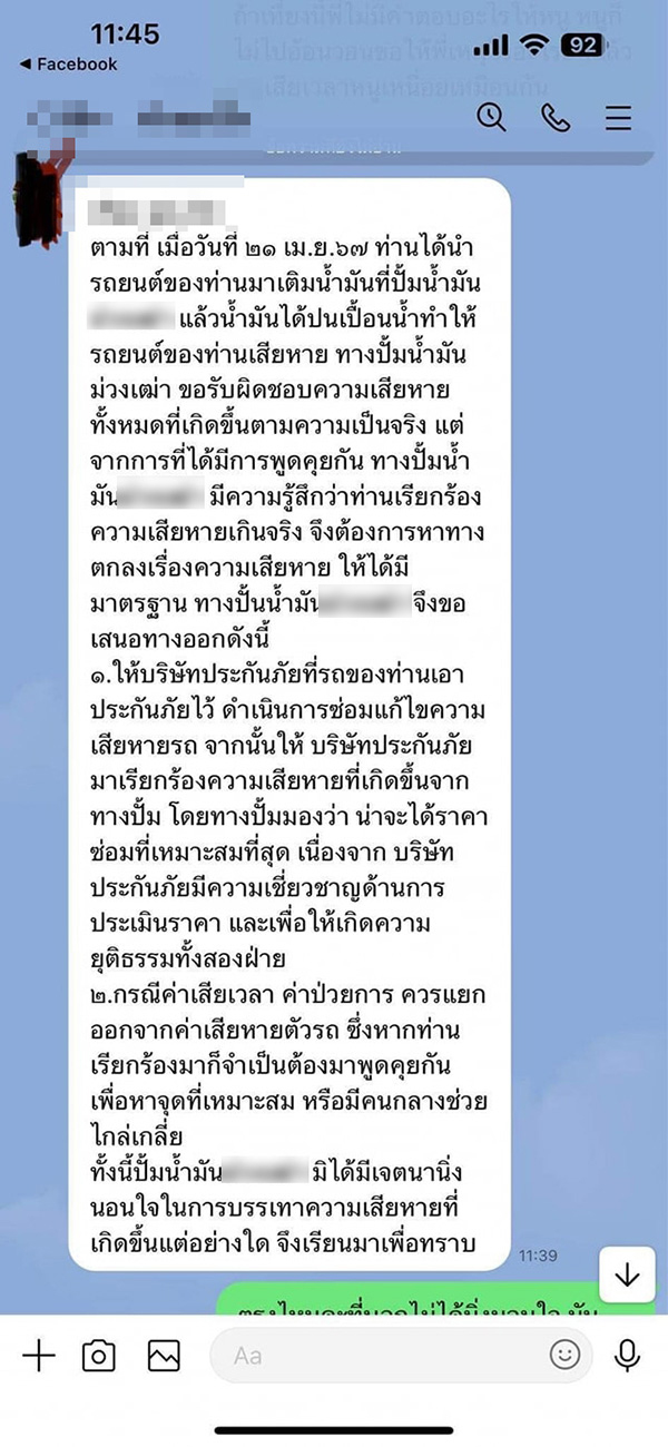ผู้เสียหายยังเปิดภาพแชตที่ส่งไปหาเจ้าของปั๊มเช่นกัน โดยเธอชี้ว่าตอนวันที่เกิดเหตุ เจ้าของปั๊มพูดว่าจะรับผิดชอบทุกอย่างเพราะก็เห็นว่ามีน้ำในน้ำมันจริง และยินยอมจะรับผิดชอบค่าเช่ารถที่ตนต้องใช้งาน แถมยังขอให้ตนเรียกประกันมาเคลมเรื่องยกรถ แต่พอประกันมากลับให้ตนยกเลิกการเคลม อ้างว่าจะขอรับผิดชอบแทน ซึ่งตนก็ตกลงตามนั้น แต่สุดท้ายกลับมาเปลี่ยนคำพูด ปัดความรับผิดชอบทุกอย่าง